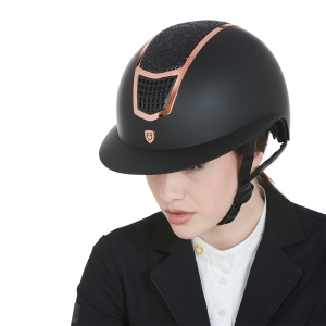 A concha exterior é opaca embelezada pela aplicação de strass tom sobre tom que tornam o capacete refinado e elegante, com entradas de ar frontais e placa com o logótipo Equestro.
