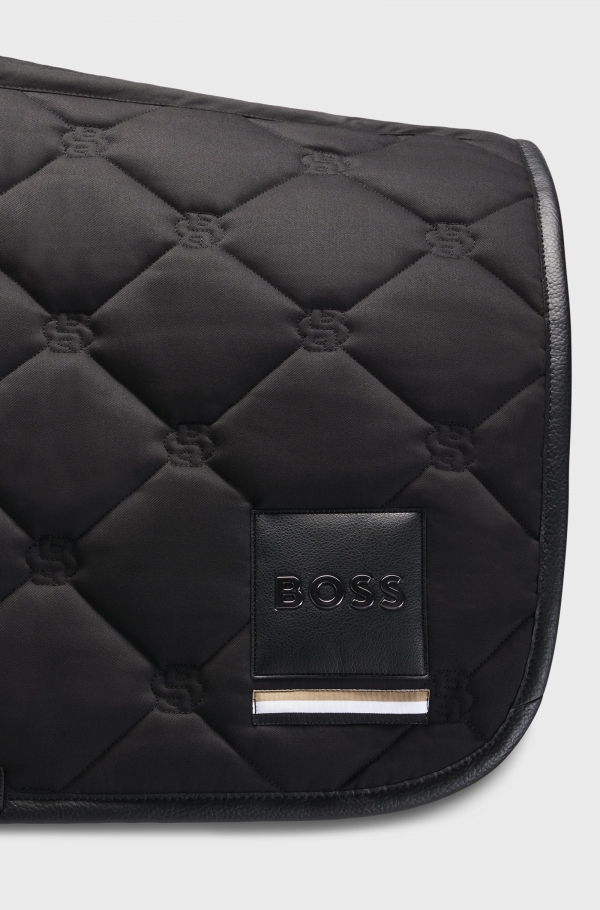 Com um acolchoamento suave para maior conforto, esta manta de sela BOSS é essencial para a proteção durante os saltos. Monogramas Double B refinados e acabamentos em tecido sintético revestido, incluindo um patch especial com o logótipo e uma faixa exclusiva. O tecido sintético revestido, por vezes chamado de couro sintético, é um tecido concebido para se assemelhar ao couro genuíno e/ou apresentar um aspeto mate, brilhante, liso ou texturizado.