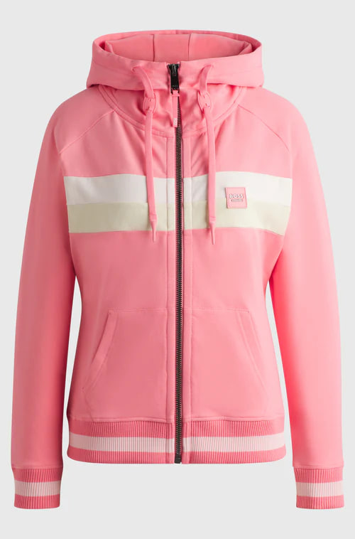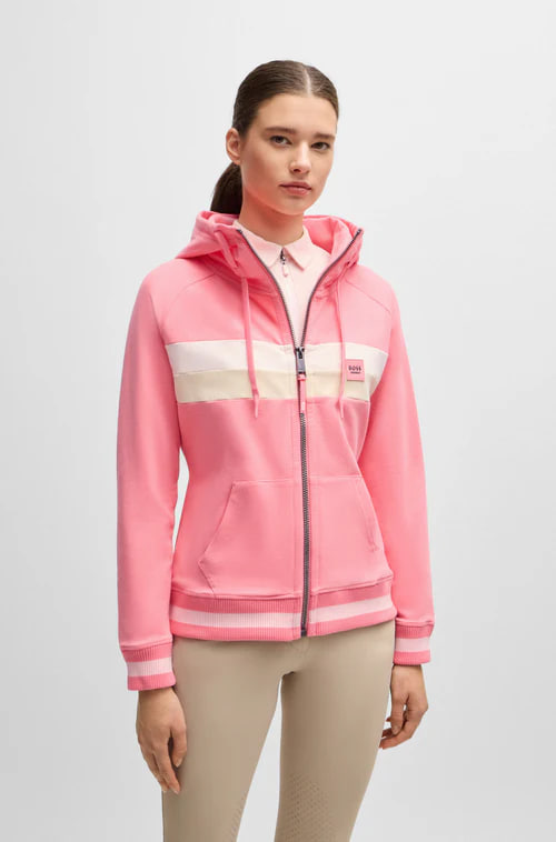 Com um logótipo em tecido sintético revestido, esta camisola com capuz com fecho BOSS Womenswear é ótima para usar como agasalho no campo. Riscas de assinatura. Algodão elástico de fabrico italiano. O tecido sintético revestido, por vezes referido como pele sintética, é um tecido concebido para se assemelhar a pele verdadeira e/ou apresentar uma aparência mate, brilhante, macia ou texturizada.