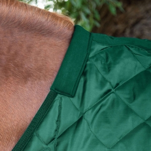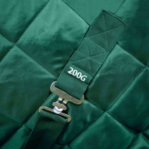O tecido acolchoado em losangos confere à manta um aspeto aconchegante, com um enchimento termoendurecível de 200 g incorporado na sua estrutura para uma maior retenção da temperatura. As fibras com tecnologia de absorção de humidade, presentes no tecido avançado, extraem e dispersam a humidade do pelo do cavalo, garantindo uma experiência seca e confortável.