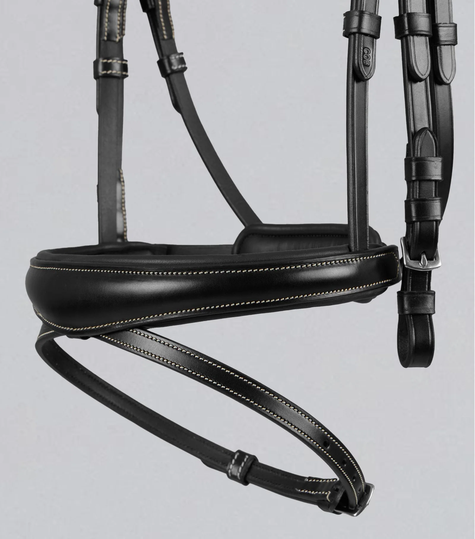A cor preta da cabeçada Cassano Snaffle confere um visual atemporal e versátil às suas características já impressionantes. A tonalidade clássica é frequentemente escolhida por sua elegância, adicionando um toque de sofisticação ao conjunto do cavaleiro, tornando-a uma opção popular tanto para o dia a dia quanto para competições.