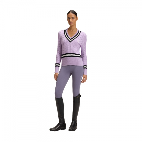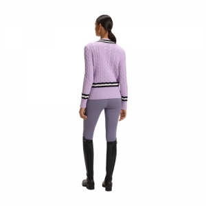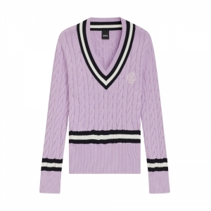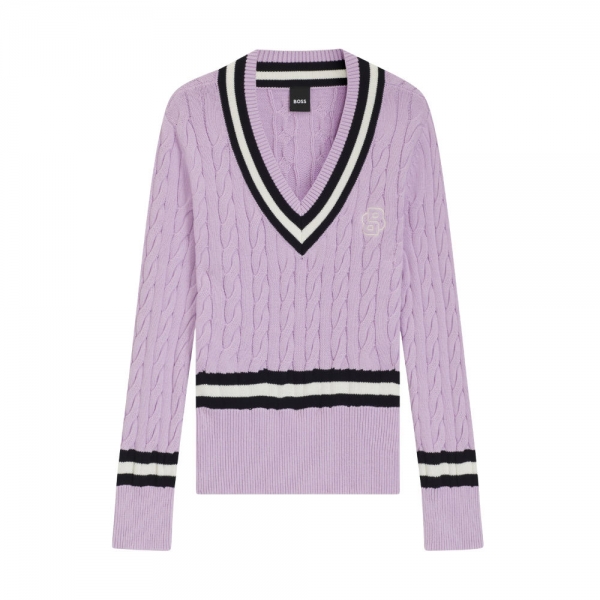 A camisola de malha BOSS Equestrian Paula Cable para mulher é confecionada num tricô plano leve e fresco, perfeito para o verão, oferecendo um aspeto clássico e texturizado, bem como uma sensação confortável. O decote em V apresenta uma risca contrastante, que ecoa o conceito desportivo do design, estendendo-se aos punhos e à base. Estes detalhes contrastantes conferem à camisola um visual moderno e dinâmico.
