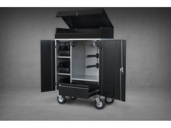 Dividido em dois compartimentos, com gavetas de plástico num dos compartimentos, permite organizar todo o seu equipamento para competições ou viagens mais longas.