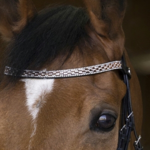Cabeçada de couro de búfalo, encosto de cabeça de couro de vaca e faixa de nariz com fixação pull-back. Faixa nasal decorada com uma borda preta brilhante brilhante. Frontal decorado com strass em ouro rosa e strass transparentes. Costura preta. Ganchos em postes de mandíbula e postes de freio. Fivelas em aço inox. Vendido sem rédeas.